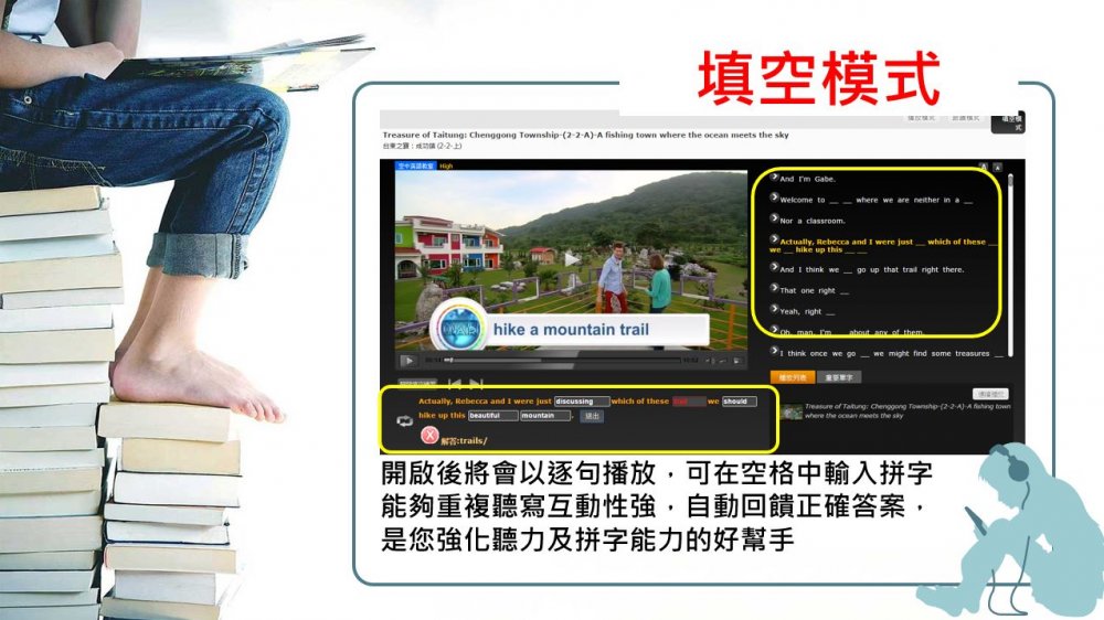 透過線上影音搭配文字同步學習;互動式克漏字聽寫練習可有效訓練聽力,課程逐句皆可重複播放訓練模仿口語聲調,課程結合線上字典及重點生字整理,每課結束亦提供複習測驗,幫助學生吸收多元主題素養並提升字彙、聽力及口語表達力。