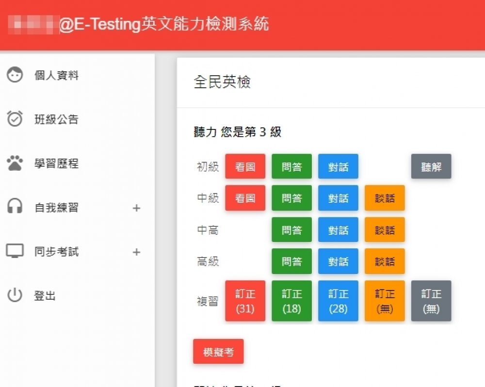 E-Testing線上英文檢測系統,內建空中英語教室專業的GEPT模擬試題,能針對GEPT聽力及閱讀題型有效練習。系統設計前測可了解學生程度。學生端可利用系統進行模擬測驗熟悉題型、可針對單項題型弱點強化。試題提供詳解,可作為自習使用。內建晉級功能幫助學生逐步打底。