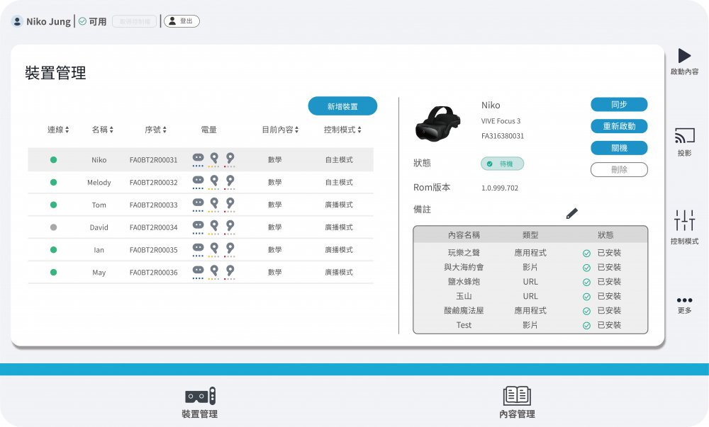 在操作者的裝置(如:智慧教室中的智螢幕/ 手機/ 平板) VIVE頭戴式顯示器上安裝中控平台應用軟體,操作者可以在簡單明瞭的介面上,檢視所有裝備的連線狀況、電力及管理裝備上的內容與更新;在課堂或教育訓練時,只需要一鍵按下啟動,就可同步推播相同內容讓現場所有的頭戴式顯示器,可透過手機/ 平板監看各個頭盔內的畫面,與課堂上所有參與者分享與解說課程內容之用。