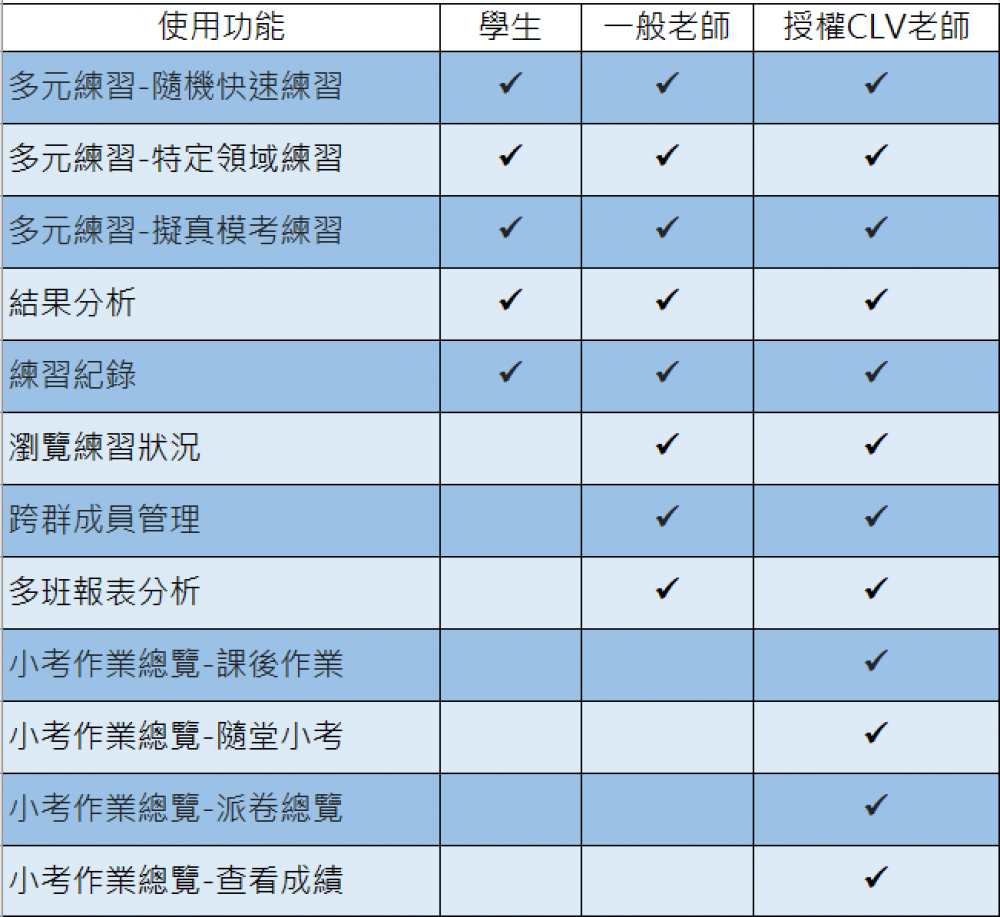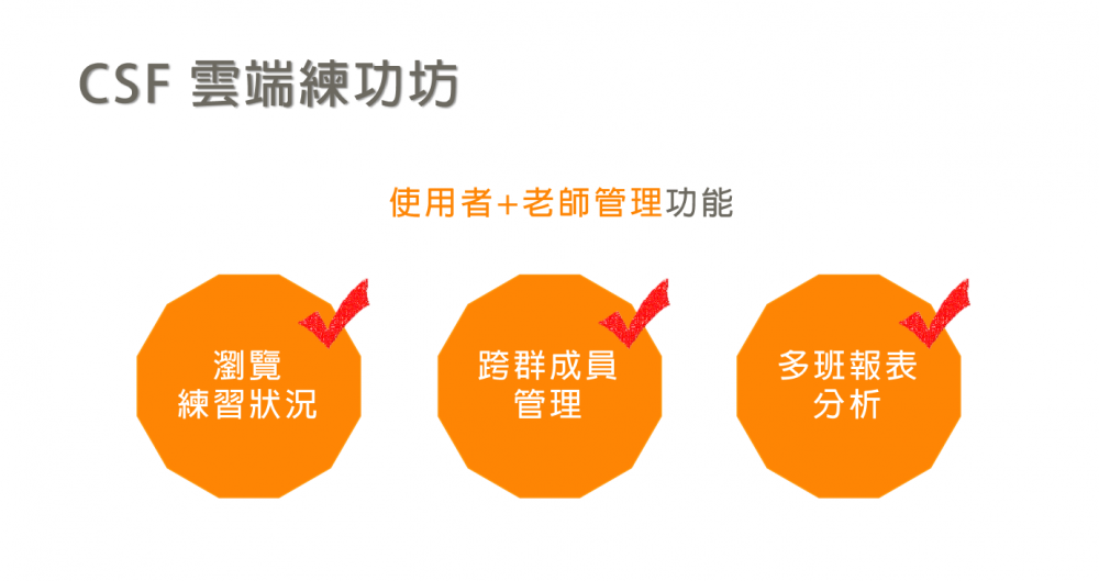 雲端練功坊為學生最佳學習輔具,老師最佳管理平台,CLV老師管理功能,提供不同階段多項功能,讓老師教學省時更有效率。