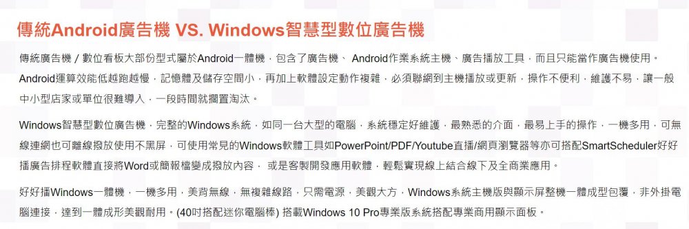 Windows智慧型數位廣告機,完整的Windows系統,如同一台大型的電腦,最熟悉的介面,最易上手的操作,一機多用,可使用常見的Windows軟體工具亦可搭配SmartScheduler好好播廣告排程軟體