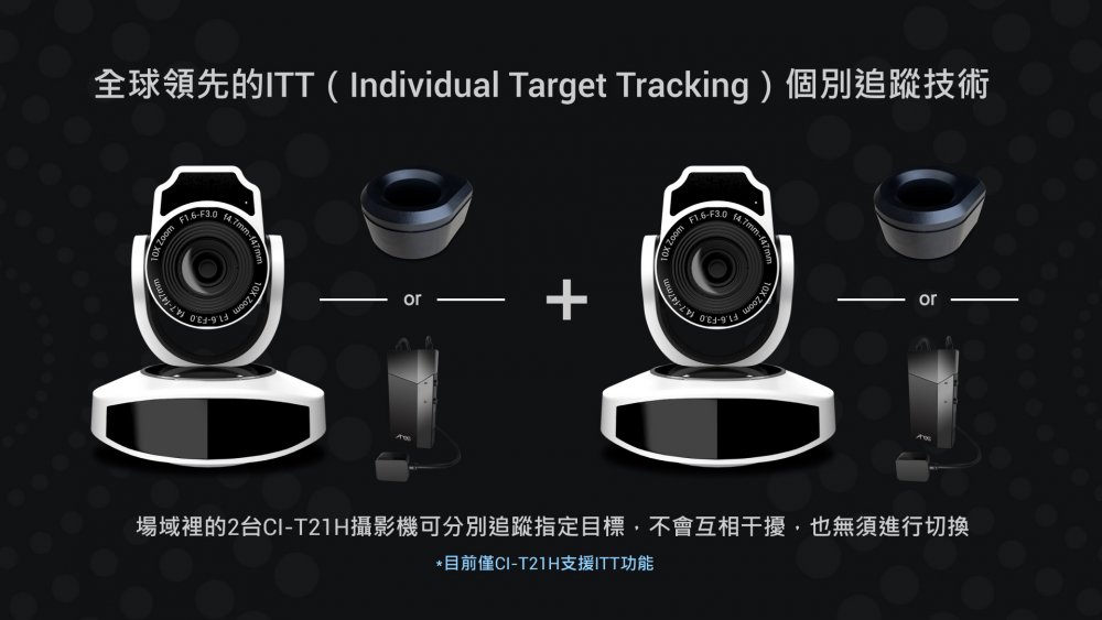 AREC紅外自動追蹤攝影機有以下三大特點:配對簡單、精準追蹤和無須繁雜設定容易整合的優點。為滿足場域需求,CI-T21H自動追蹤攝影機新增加ITT個別追蹤功能,可實現雙追蹤的完美拍攝。