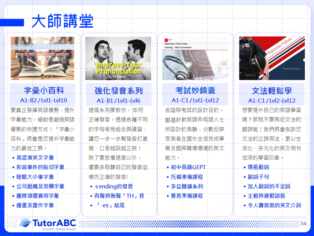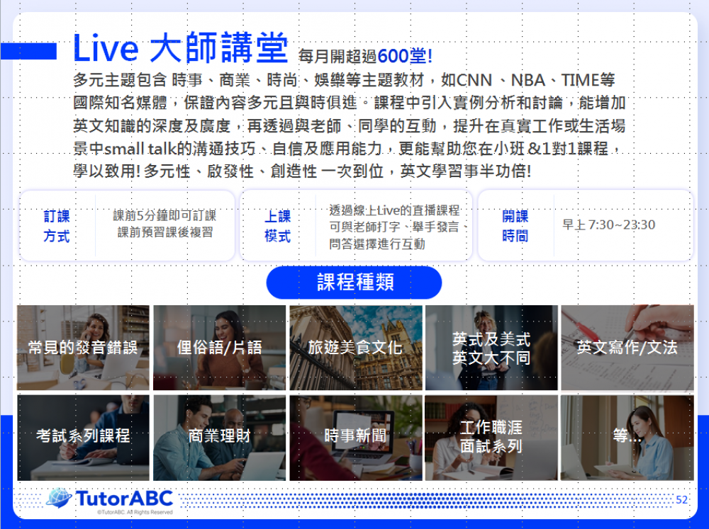 TutorABC大師講堂致力於為學員提供高品質的英語學習體驗。課程涵蓋多元主題,包括時事、商業、時尚、娛樂等,並使用來自CNN、NBA、TIME等國際知名媒體的教材。課程中引入實例分析和討論,能增加英文知識的深度及廣度,並透過與老師和同學的互動,提升在真實工作或生活場景中的溝通技巧及應用能力。