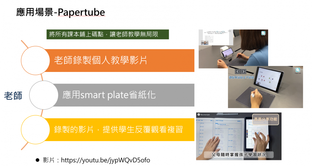 Neo 智慧學習空間方案,首先協助學校,快速傳統教育轉型,只要提供紙本教材和知識點及教學影片,數位轉型立即完成。我們四款強大的APP,提供老師學生無限可能,隨時隨地學習,學生可使用現有的手機或平板,一樣搭配紙本教材,讓我們保有手寫的習慣,但同時又能擁有科技的便利;錄製影片的功能,讓學生自主分享,練習表達自己的想法;筆跡電子化的功能,協助老師檔案電子化,結合google Classroom,減輕老師負擔,輕鬆批改作業。