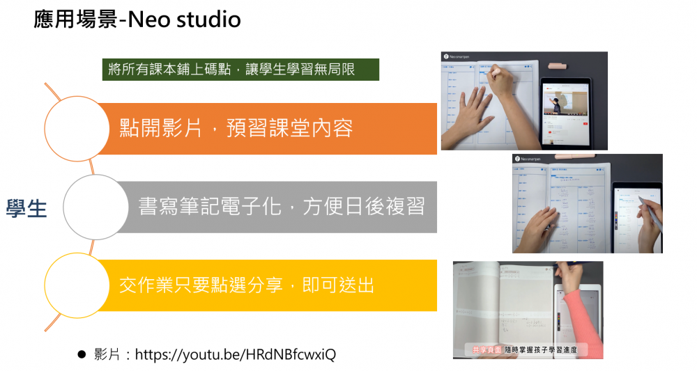 將傳統紙本講議,透過Neo智慧教育數位方案,成功轉型,學生在家只要有一隻Neo smartpen、一隻手機或平板和講議,隨時隨地都可以上課,不懂的地方,輕輕一點,還能反覆觀看。Neo smartpen兼具點讀筆與手寫的功能,讓孩子能夠專注學習,但又能有科技的輔助,搭配強大APP功能,筆劃重播、分享頁面(繳交作業)、錄音功能等等…一隻筆帶出無限的可能。