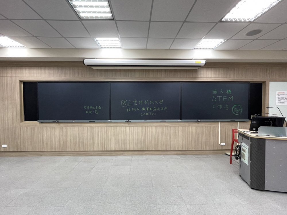 雲林科技大學這間教室場地較大,搭配無塵電子黑板90吋三片,如需要播放影片,將投影布幕拉下來即可