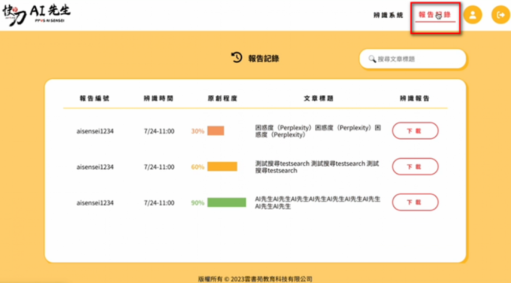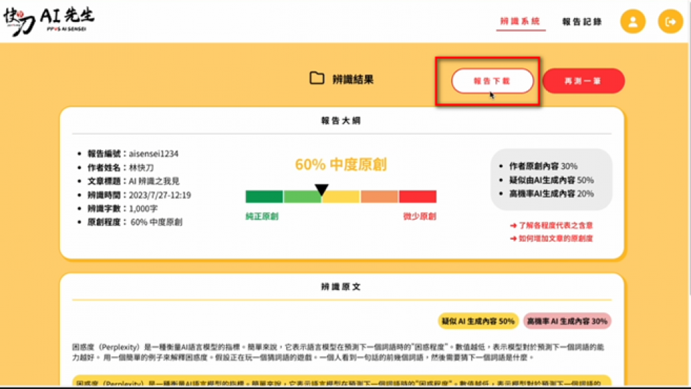 ※ 利用快刀專利核心技術,結合困惑度分析文本中的語言特徵,如句子結構、語法、用詞等,以辨識由 GPT4、GPT3、GPT2、BERT、Jasper等AI語言模型所生成的文章。此外,快刀AI先生還能識別出文章是否※ 使用翻譯軟體,為您提供全方位的文本分析與辨識服務。