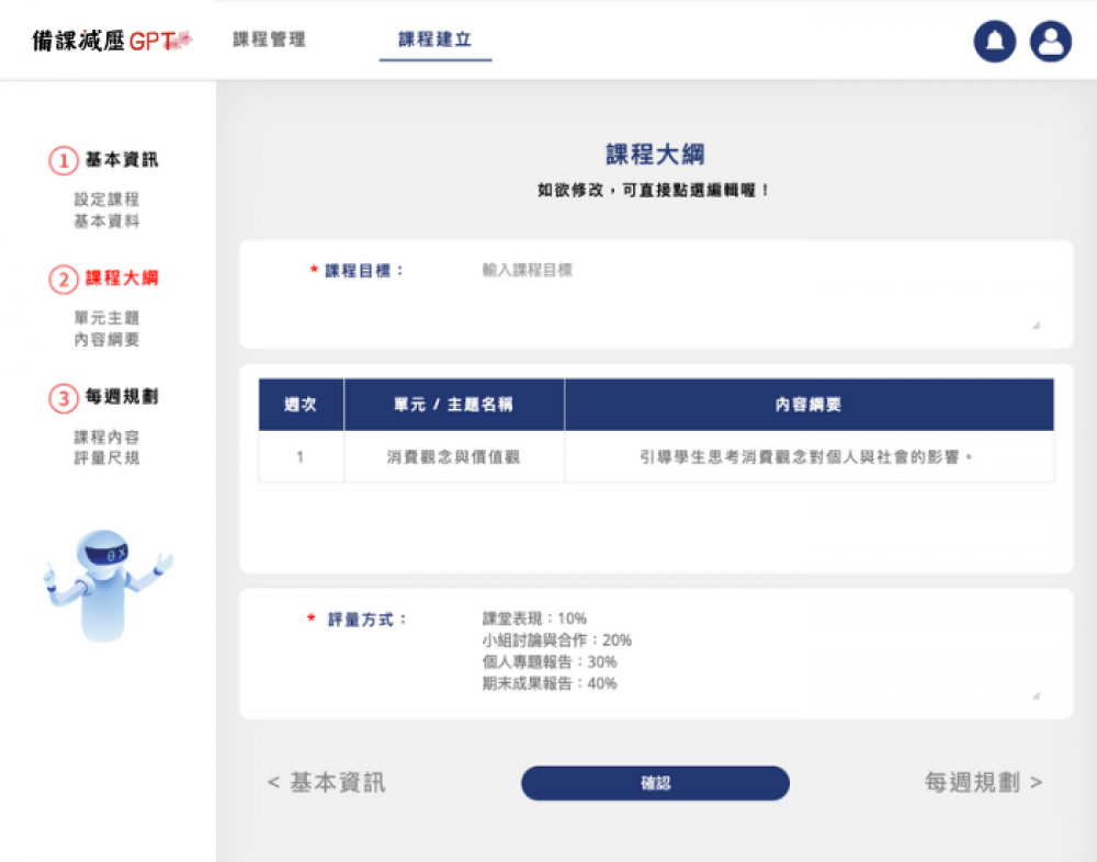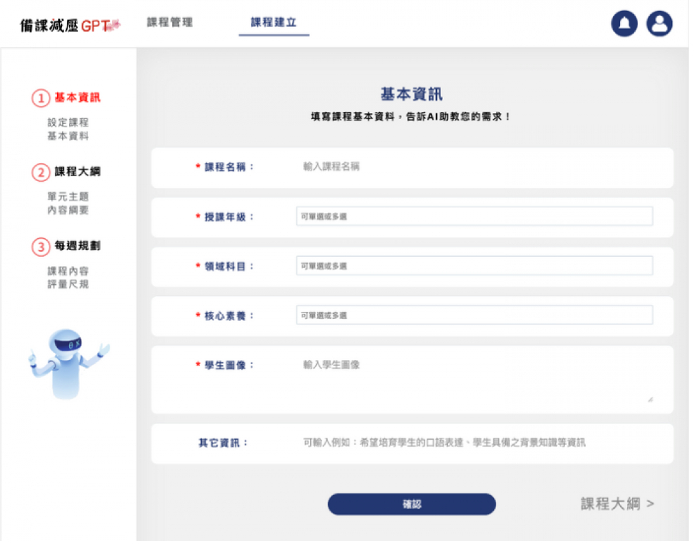 備課減壓GPT是一套結合教師備課專業需求與ChatGPT的教學應用系統,專為教師量身打造,幫助老師快速設計課程,並確保學生能夠達到目標核心素養和能力,減輕老師備課的壓力,並將更多時間聚焦於教學現場的互動與反饋。