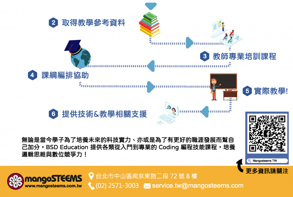 mangoSTEEMS 重視孩子的認知發展、核心素養及技能養成,我們透過在地化的專業人才,提供最切合當地需求的諮詢與服務,致力於將高品質的教育科技產品帶入各級學校,為現行教學機構導入尖端創新的教學資源,並協助教育工作者迎向「跨域學習,素養導向」新時代。