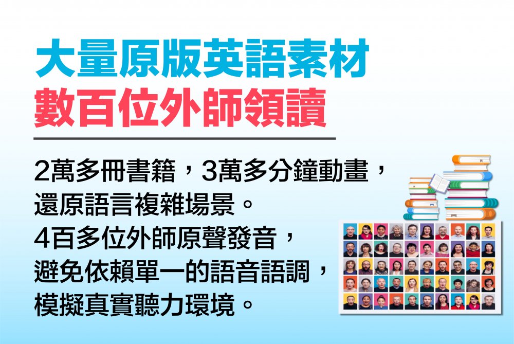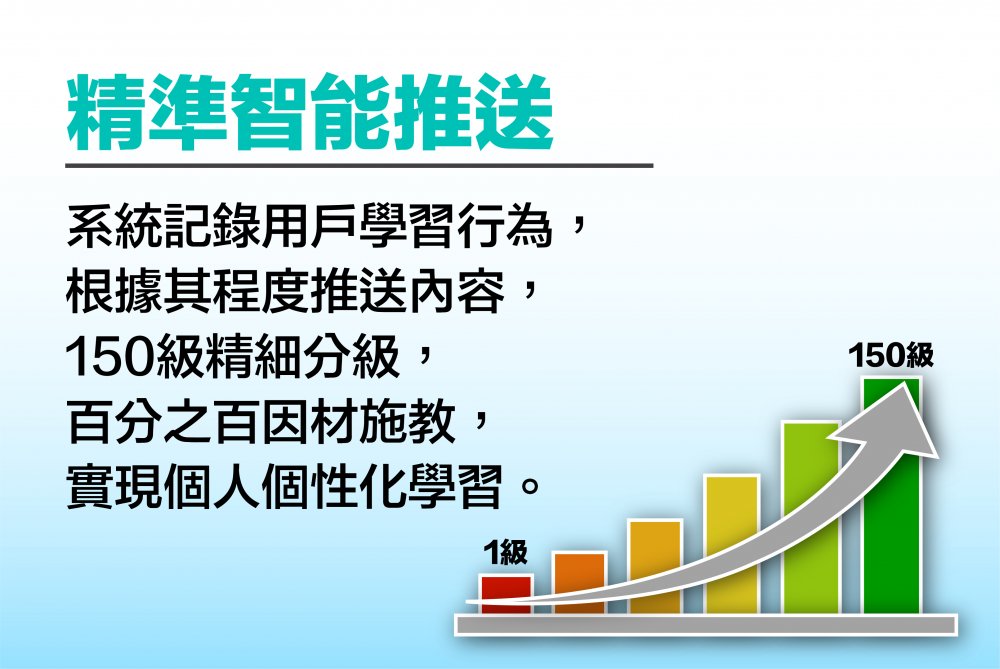 系統利用 AI 智能測評精分為150級,內含2萬多冊原版書籍、3萬多分鐘原版動畫、400多位歐美外師原聲領讀、智能糾音,幫助學習者培養語感,練就自信口音。