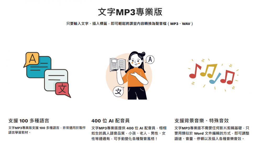 1. 製作數位教學教材時,能將課程文字内容快速轉換為聲音檔,用於學校內社群、網站、電子書,讓學生可以隨時重覆聆聽吸收内容,或是將聲音檔結合教學簡報與影片中。