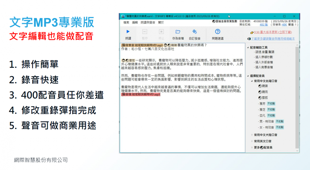2. 提供更多不同風格的發音人聲音供選擇,在同一篇文章中,可以切換為不同發音人朗讀內容,並且輸出為MP3或是WAV聲音檔案。