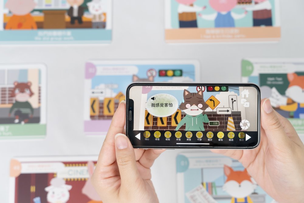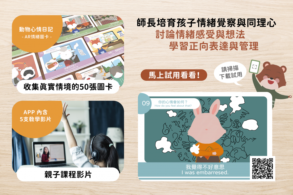 動物心情日記是結合AR科技及圖卡的桌遊產品,運用AR技術,讓精美的情境圖卡動起來,孩子可以自由選擇圖卡上的動物表情,增添互動樂趣,家長可以透過孩子的選擇探索孩子內心想法。