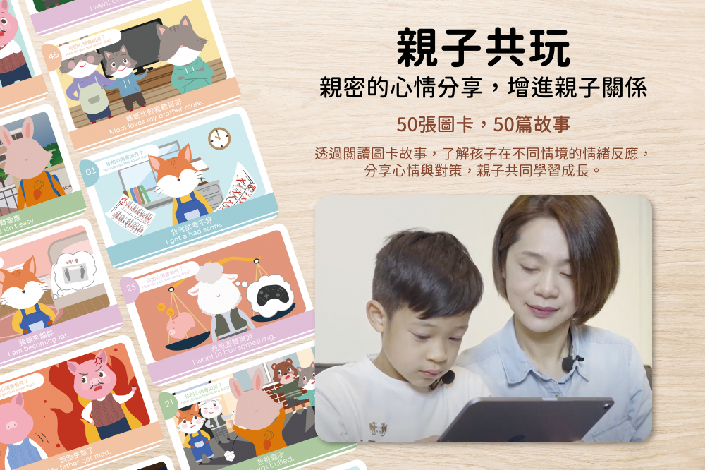 50張圖卡,50篇故事。來自家庭/學校/同儕/個人的四種類別,貼近孩子的生活,幫助探索