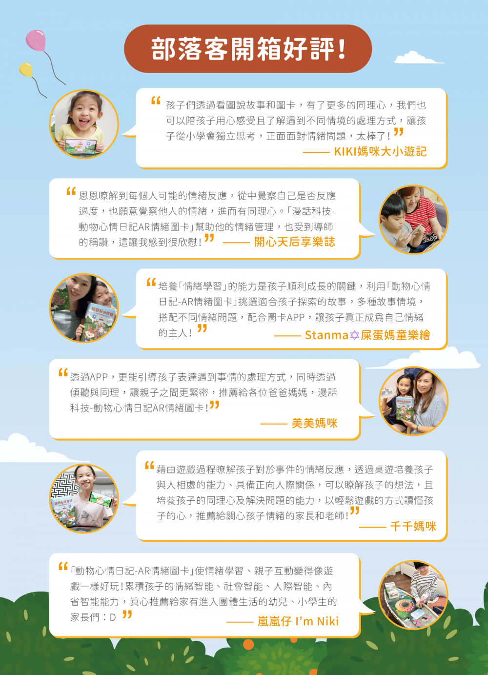 KiKi媽咪和我家孩子非常喜歡這一套『動物心情日記』和孩子在玩的時後都能享受在其中,更增添親子互動的時光。爸爸媽媽都可以一步一步拿著圖卡和孩子說故事,就像是帶著孩子看繪本讓孩子喜歡圖卡在互動式的學習,啟發他們對情緒的感受與思考,進而增加對他人的同理心,與對事情的處理態度正確的引導。