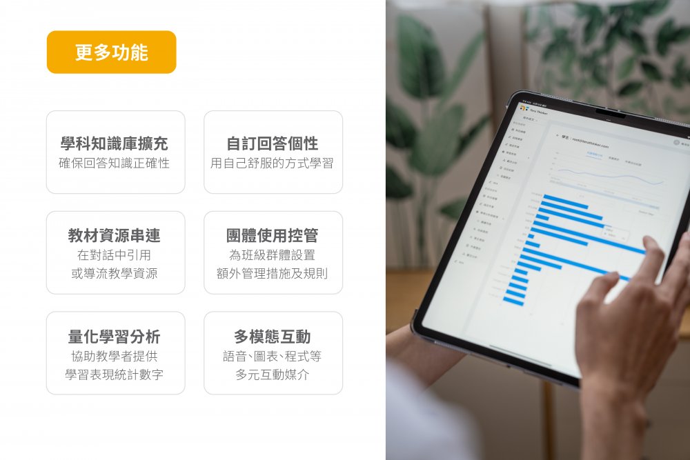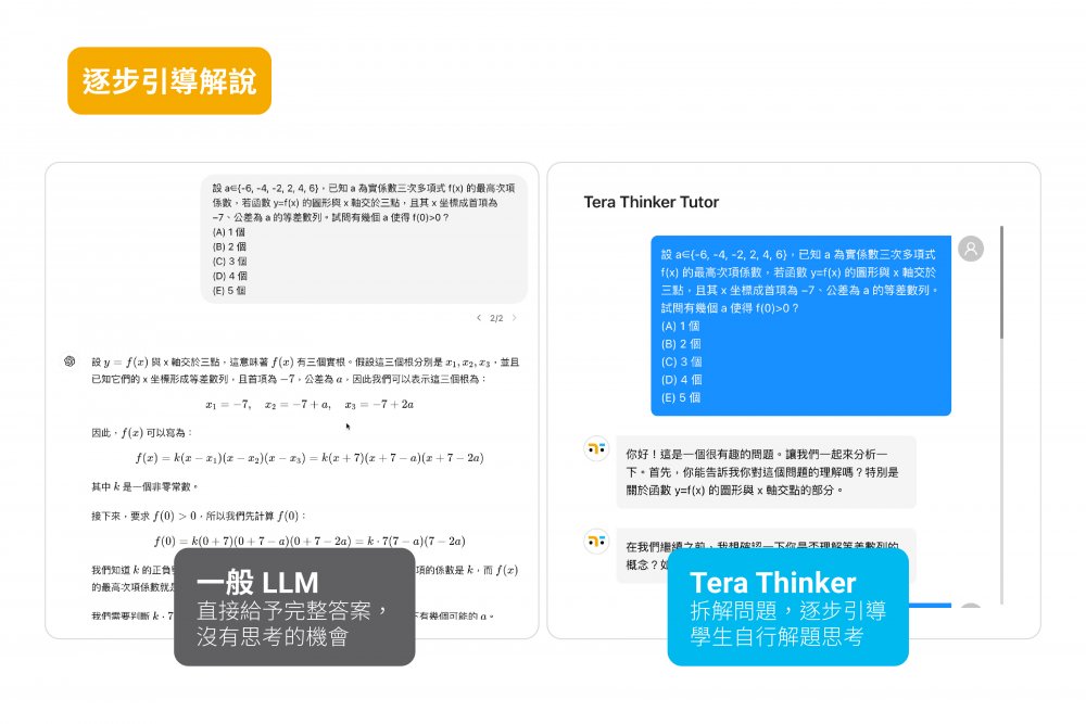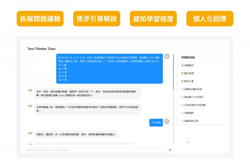 Tera Thinker AI 智慧家教學習平台,能透過線上對話與學習,精確分析學生的學習進度和弱點,進而推薦合適的練習、教材及個人化的生成式 AI 教學對話。