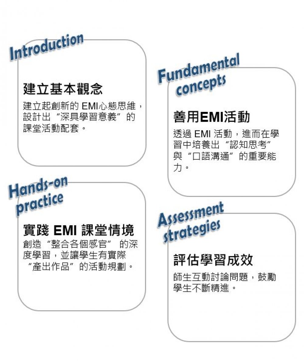 1. Introduction – EMI基本觀念的建立。EMI 課程不單單是將原本內容改用英文講一次這樣簡單,而是要設計出“深具學習意義”的課堂活動來配套。若老師可以建立起創新的 EMI 心態思維,在後續課程活動設計上將可更得心應手。