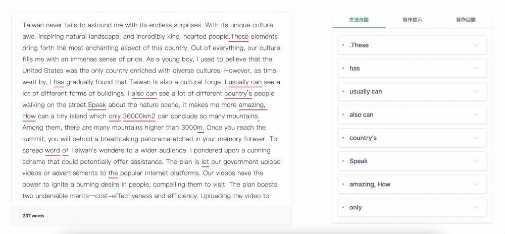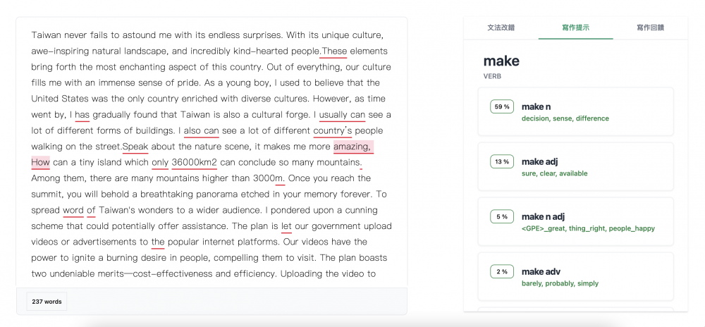 團隊鑽研多年的自然語言處理模型,使系統具備專業且精準的字句與文法改錯、更提供學習者下一步的寫作建議(相關單字與片語用法),並導入 ChatGPT 技術支援句子改寫優化,以及解釋錯誤與改正的方向,另外,寫作評量功能讓您時時看見成長的足跡。