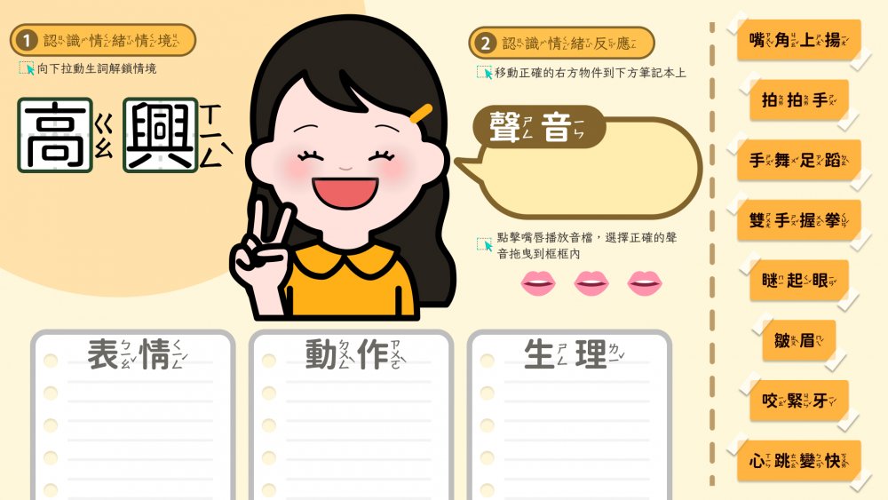 本課程以 108 課綱之特殊需求領域-社會技巧中三個向度:處己、處人與處環境為主軸,涵蓋認識情緒概念、覺察情緒、處理情緒技巧等等學習內容。輔以 myViewBoard 科技輔助工具為載體,藉由數位操作介面增加互動性,並從一步步具體呈現的鷹架中,帶領學生先認識不同的情緒,並了解情緒可能有哪些變化,也透過教材活動學習如何辨別情緒。最後,學習在不同情境下運用多元情緒管理的策略,逐步培養健全的情緒素養,為孩子未來的社會人際互動奠定良好的發展基礎。