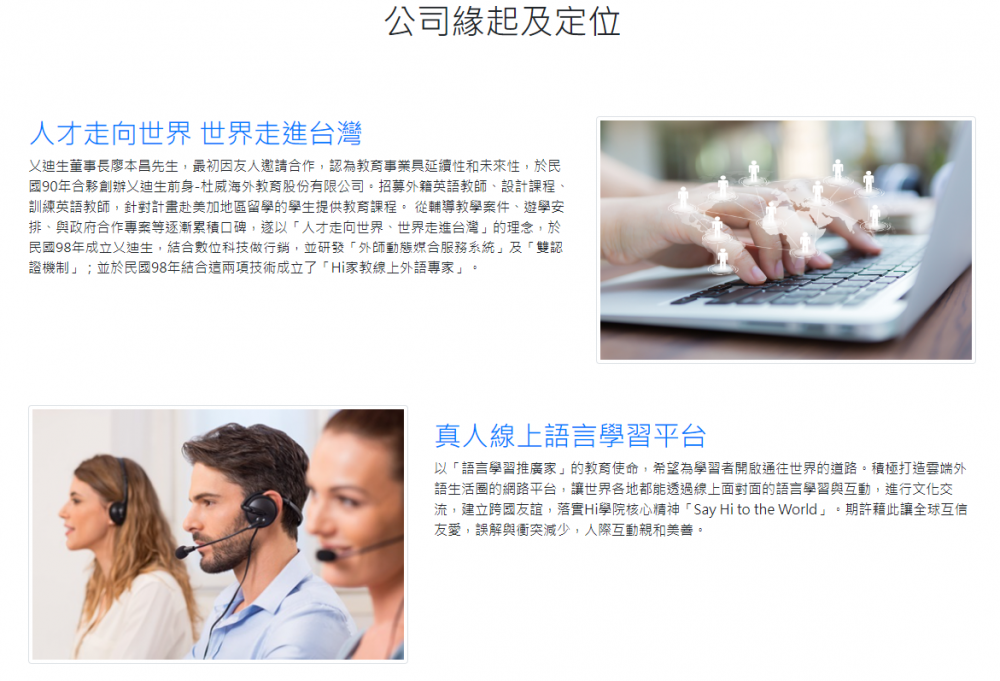 旗下杜威外師網、杜威遊留學、Hi家教線上外語家教,不僅提供學員不同面向的語言學習服務,更擁有廣大的外語師資人才資料庫,不論學校、補習班、企業外派、線上學習,都能滿足各種需求。