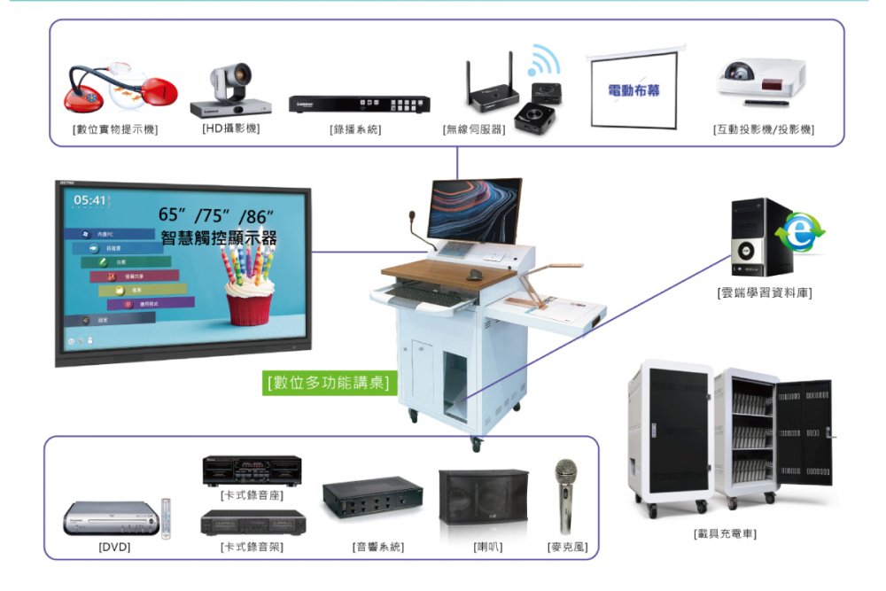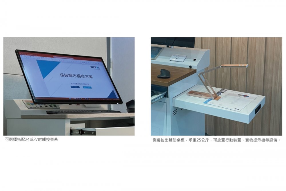 教育市場市佔率第一『JECTOR 數位多功能e化講桌』!能整合多元設備,將鵝頸麥克風、擴音機、大尺寸顯示設備、電腦主機螢幕、機上盒等設備整合一體,且人性化貼心設計,讓教室煥然一新,感受數位生活的全新體驗。