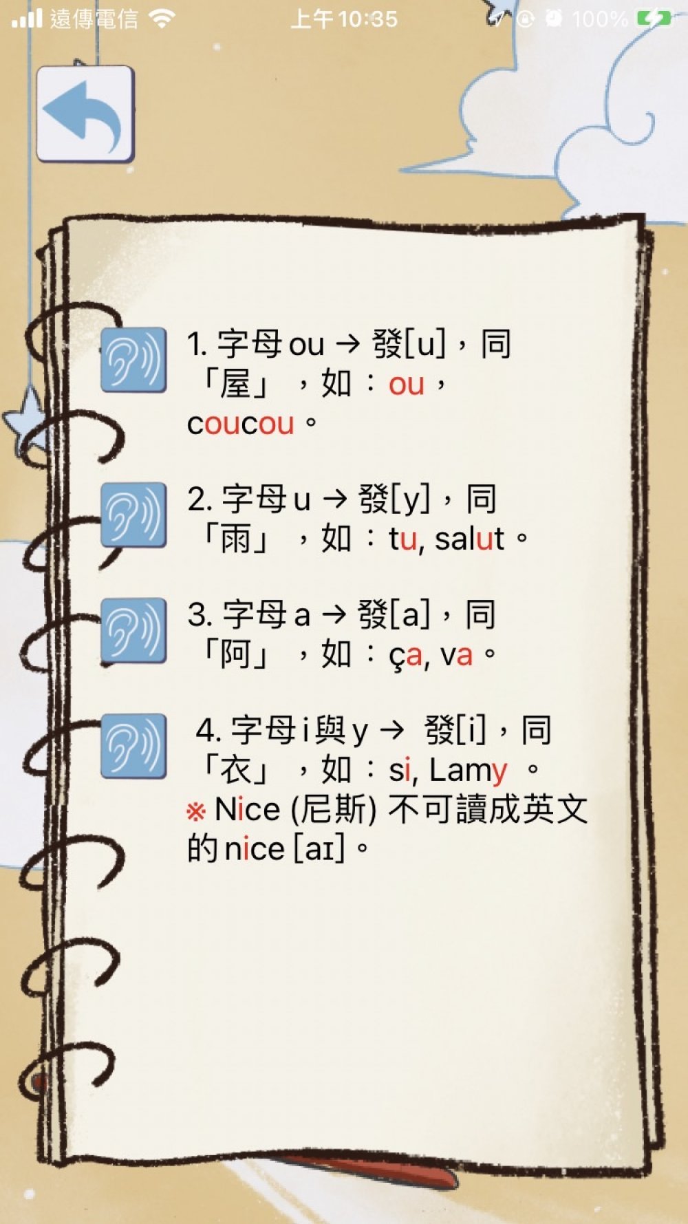 學法語擔心沒機會開口說嗎?,讓小王子陪你模擬對話,幫你解決這個煩惱!透過手機、平板就可以開口練習法語。模擬對話與互動式遊戲強化學習,聽力上有法籍專人配音的純正自然發音、語調;口說上有語音辨識系統評分發音程度,大幅增強法語聽、說能力。課程主題生活化,囊括食、衣、住、行,邊學法語邊了解法國文化,更有文化膠囊帶你領略法國風情。從日常字彙、基本句型到文法秘笈,還有『發音竅門』的貼心教學。由任教於中央、淡江大學法文系的資深優秀教師群編製,內容充實嚴謹,教學由淺入深、循序漸進,法語初學者也適用。