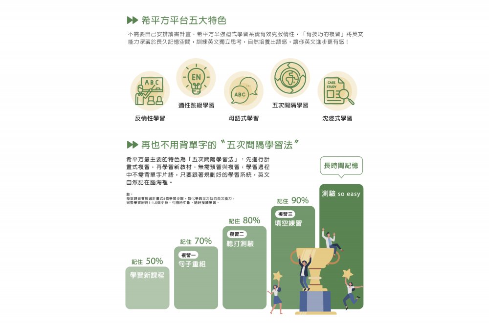希平方主打「五次間隔學習法」,讓學生在不用背單字的情況下,透過計畫式的學習和複習,提升英語聽說讀寫能力。希平方更提供多種主題和程度的課程,滿足不同學習者的需求!