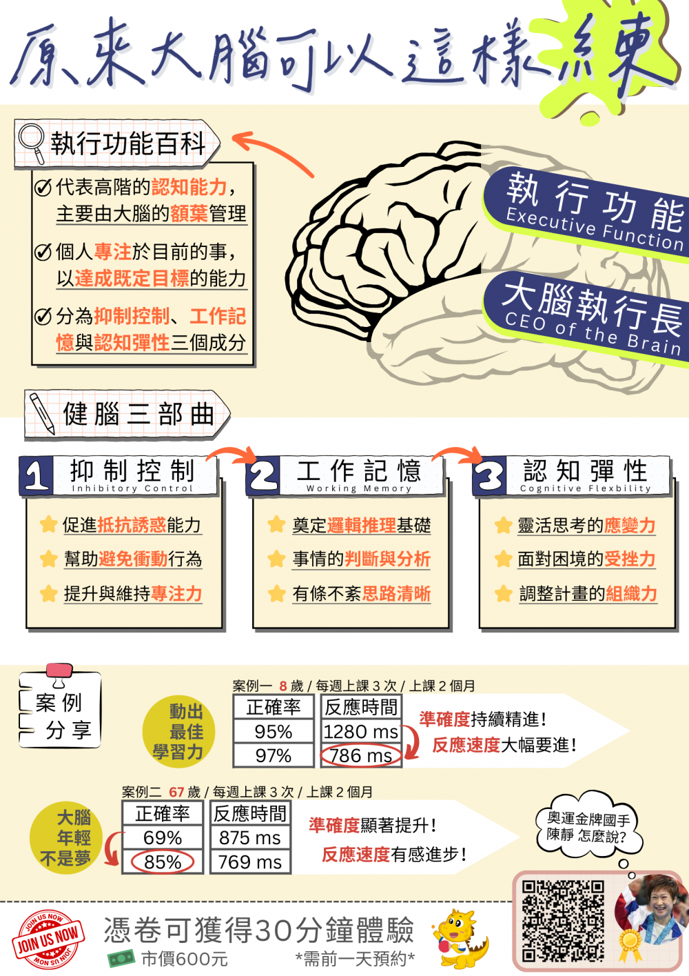 腦力開發運動課程,主要希望透過運動認知神經科學,以「運動結合腦力」的研究成果,實際落地深化成為大眾所能享受的桌球運動課程。