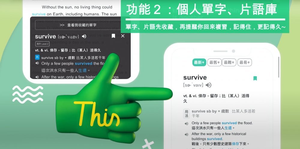 提供重點單字、例句發音「隨點隨聽」,可任意收藏至「我的單字庫」,再結合 AI、「遺忘曲線」原理,透過 LINE 主動推播提醒複習,答對了還有小小獎勵,學習更有動力!