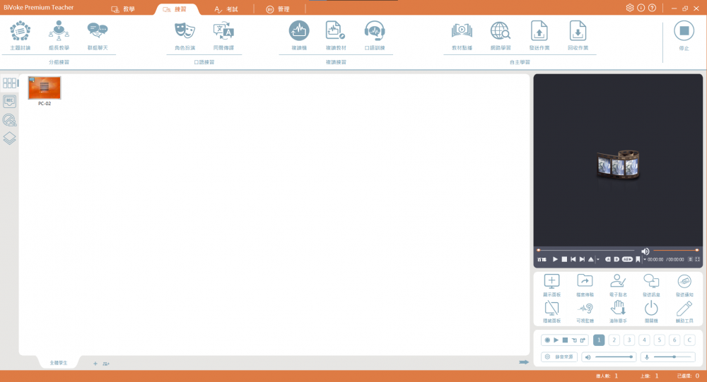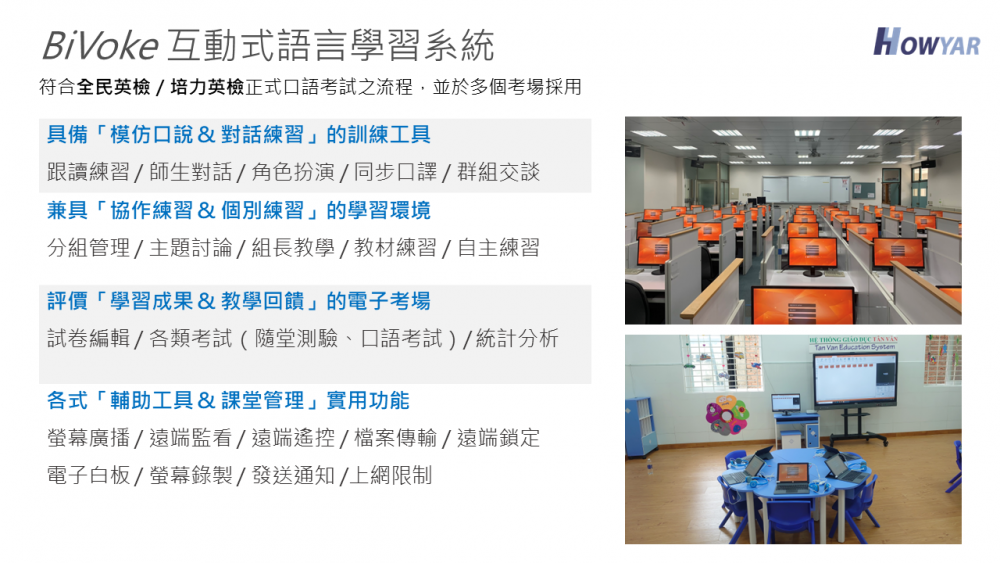 透過BiVoke各項功能的執行,可實現老師規劃設計的各種課程學習方式,如:語音教學&視聽教學、上課教學&自主學習、協作練習&個別練習、線上測驗&口語考試、個別指導&傳輸互動…等,並能透過系統功能,輕鬆做好課堂管理。