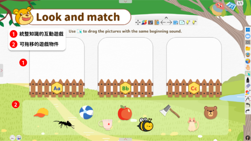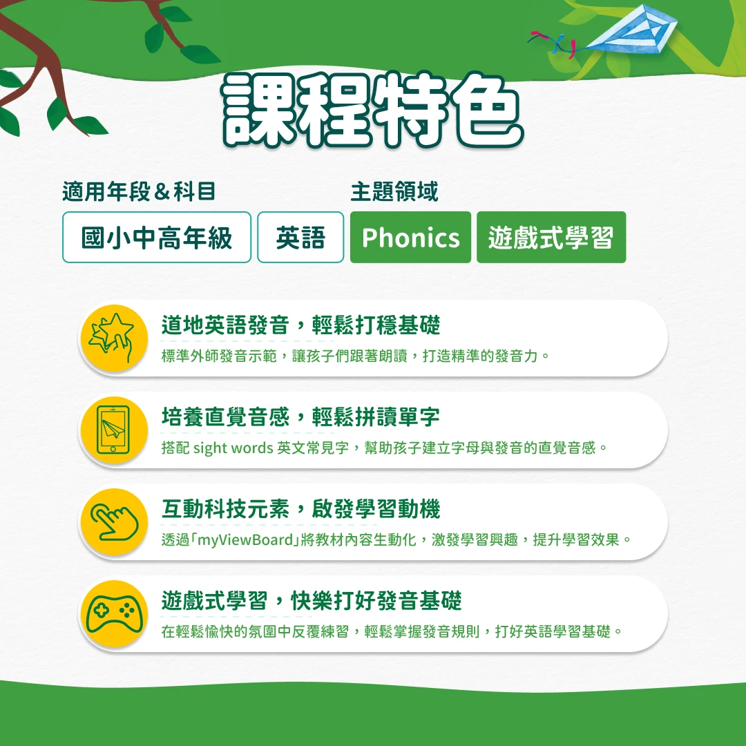 教材內容涵蓋 26 個英文字母、短母音、長母音、子音、複合子音等主題,並搭配外師示範字母與單字的發音,幫助孩子建立精準的發音基礎。此外 myViewBoard 提供多元的互動功能,讓孩子透過拖移物件、點選互動、繪圖等方式,在趣味的遊戲中反覆練習發音與拼字,全面提升聽、說、讀、寫四大英語能力。