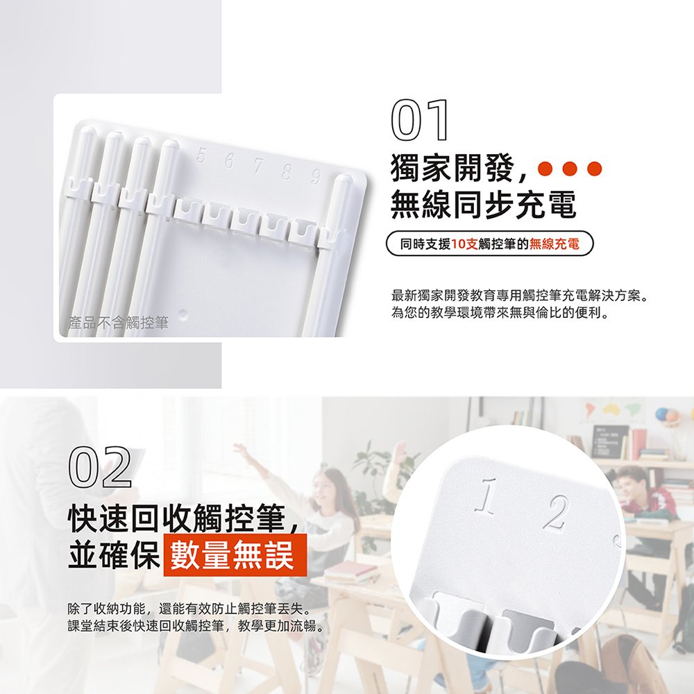 最新獨家開發教育專用觸控筆充電解決方案。可同時支援10支觸控筆的無線充電,為您的教學環境帶來無與倫比的便利。
