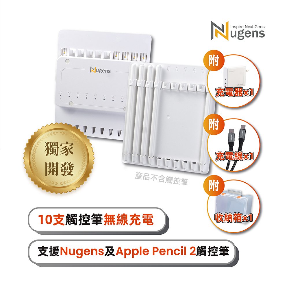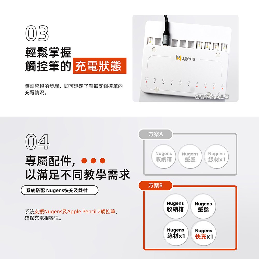 系統搭配Nugens快充及線材,並提供10支或30支裝的收納箱選擇,以滿足不同教學需求。此外,系統支援Nugens及Apple Pencil 2觸控筆,確保充電相容性。