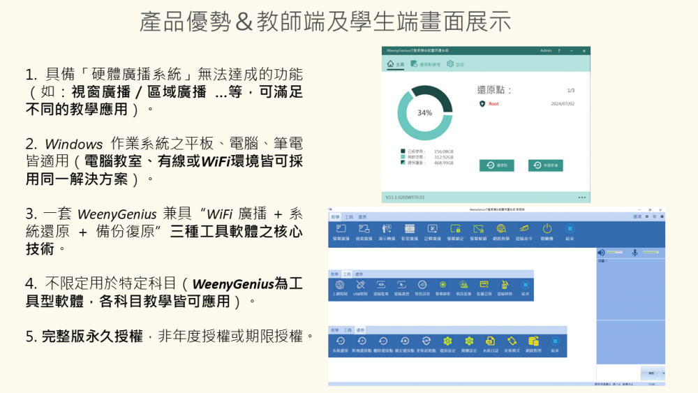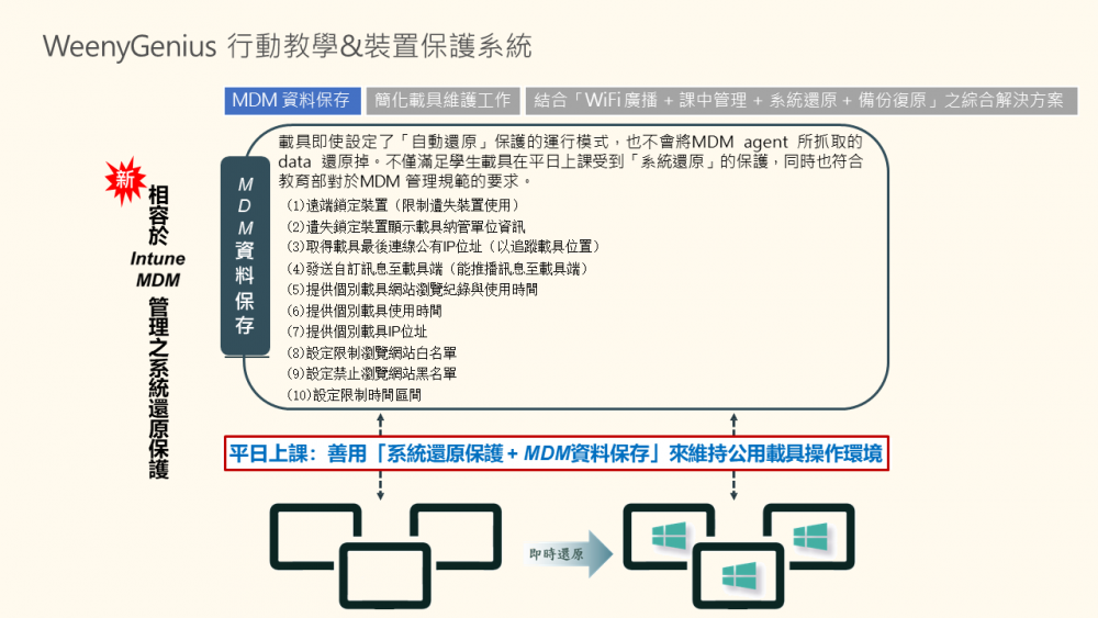 不僅提供“系統還原”和“WiFi廣播教學系統”功能,還符合教育部MDM管理規則。即使載具設置了「自動還原」保護,仍能保存MDM資料,確保安全與隱私,讓載具維護人員能安心使用「系統還原」來快速恢復環境。「系統還原 + MDM資料」同時滿足課堂教學及主管機關需求,簡化維護和管理