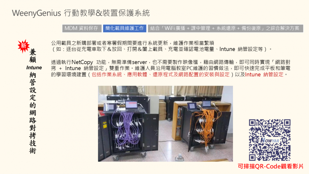對於精進方案的載具,程式中的NetCopy功能可實現「網路對拷」與「Intune納管設定」。亦即透過「網路對拷」做更新維護時,可同步進行「Intune納管設定」。維護人員只需按照維護電腦教室PC的習慣,即可快速完成平板和筆電的學習環境建置,完成作業系統、應用軟體、網路配置、AAD註冊、系統還原保護、加入Intune等設定