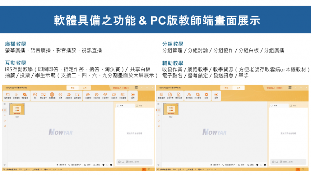 TeenyHopper 提供多項便利功能,透過網路傳輸,讓老師輕鬆進行「大屏教學」,運用大屏分割顯示,展示學生學習成果及分組協作進度,鼓勵積極參與。同時支援互動教學/分組教學/廣播教學等活動,具備 IRS、抽籤、投票、分組討論、分組白板、分組廣播、螢幕廣播、影音播放、語音廣播、視訊直播、作業收發、網路教學、螢幕鎖定、共享白板等功能,方便師生使用雲端教學資源和線上學習工具,將數位教學融入傳統課堂。