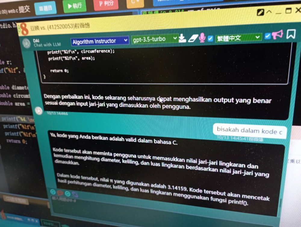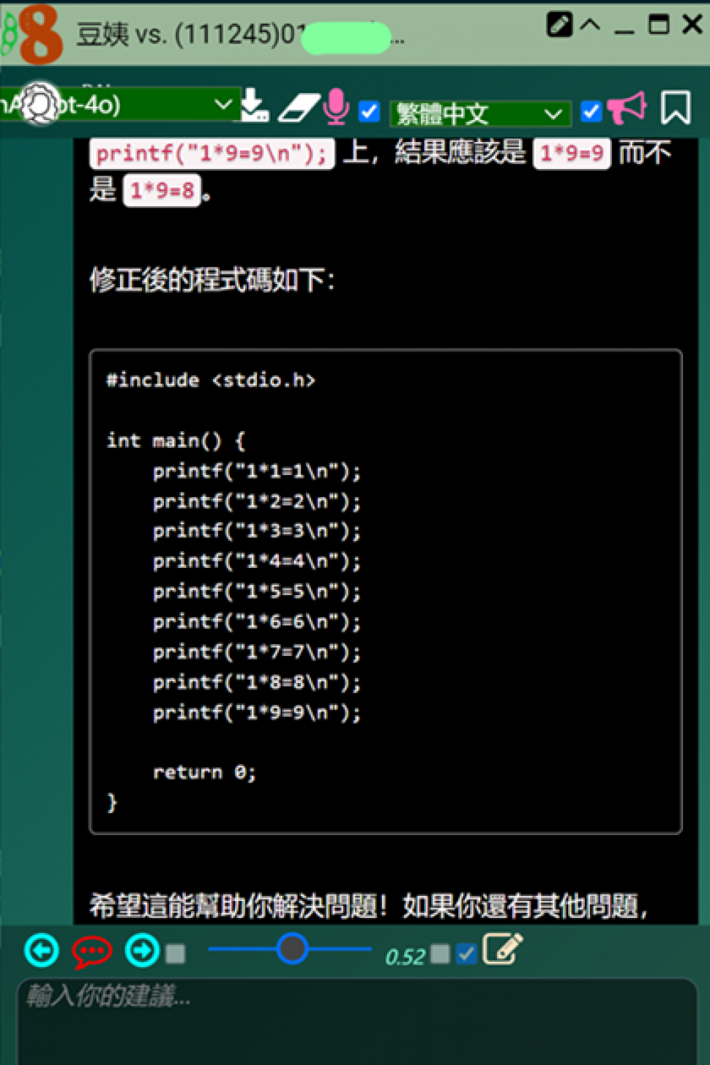 在一個程式設計課中,多數的學生是來自台灣的學生,少數來自不同的國家,案例中有來自俄羅斯與印尼的學生;這兩位學生在學習程式語言的同時多了一份來自語言的障礙,豆姨助教精通各種語言,兩位學生可以不用他們不會中文與不精通與英語來與豆姨對話,而是可以使用她們自己國家的母語來學習程式設計。
