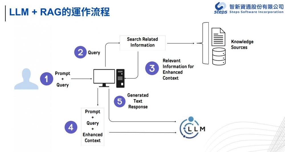 並可透過 LLM+RAG 建立專屬知識庫、智慧客服問答系統、AI學習成效評估系統、助教機器人等,減輕及降低業務單位人力成本,解省原本需要花費的工作時間。
