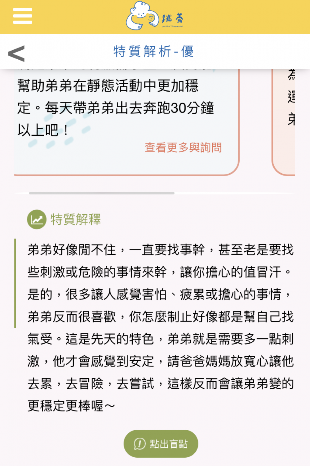 過往的教育並沒有教導我們『如何成為一個好家長』,而我們只能夠用自身的經驗來應對。而「跳養」具備四個國家的專家AI診斷系統專利,能協助爸媽快速辨識孩子狀態,以及給予引導孩子成材的教養實作方向。