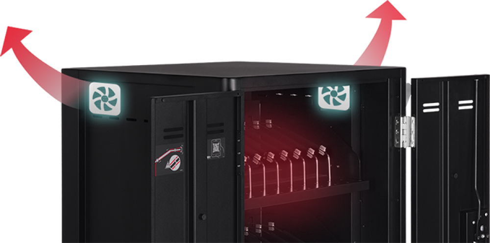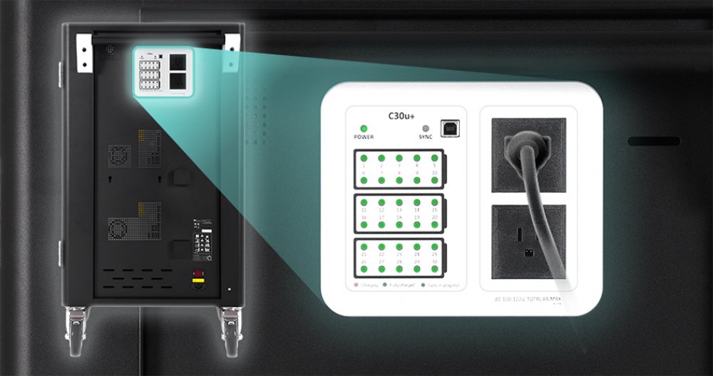 C30u+ 充電同步車擁有不佔地的外型,特別適合空間節約的教室規劃。配備 30 組獨立的 USB Type-C 插槽,可儲存、充電和同步多達 30 台 iPad®、AndroidTM、Windows® 或 ChromebookTM 平板電腦。三層式活動式托盤設計,讓學生取放平板更快更便利。C30u+ 以安全為第一考量,機身配置雙風扇,幫助充電時有效散熱;三點式安全鎖的前後門和可上鎖腳輪,防竊盜也防傾倒。有了 C30u+ 做最佳後衛,充分滿足老師隨時隨地行動教學的機動性。
