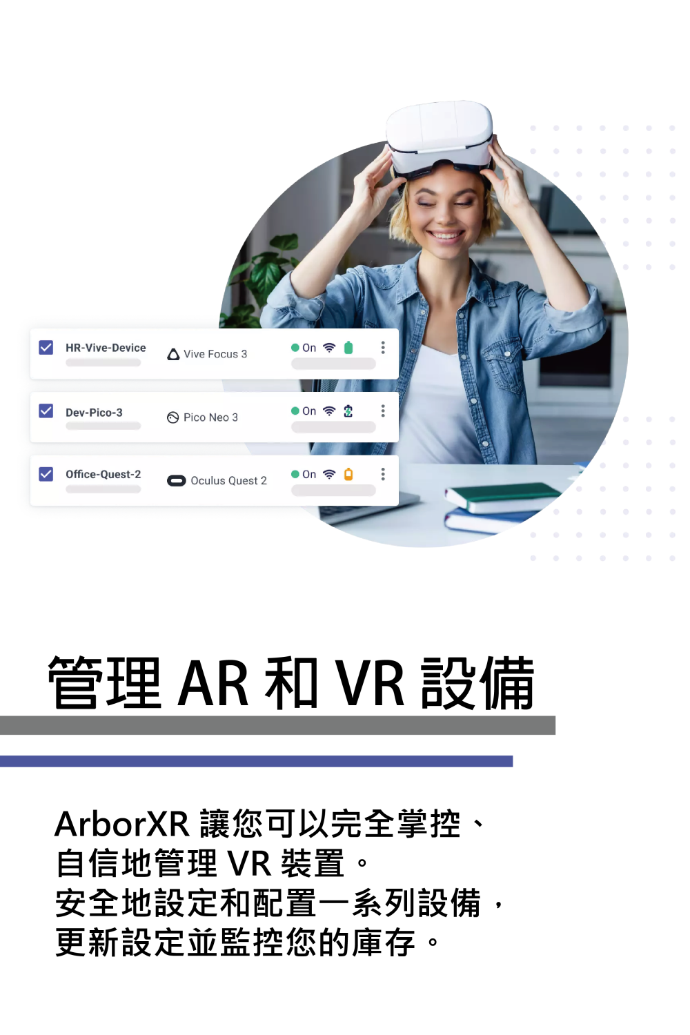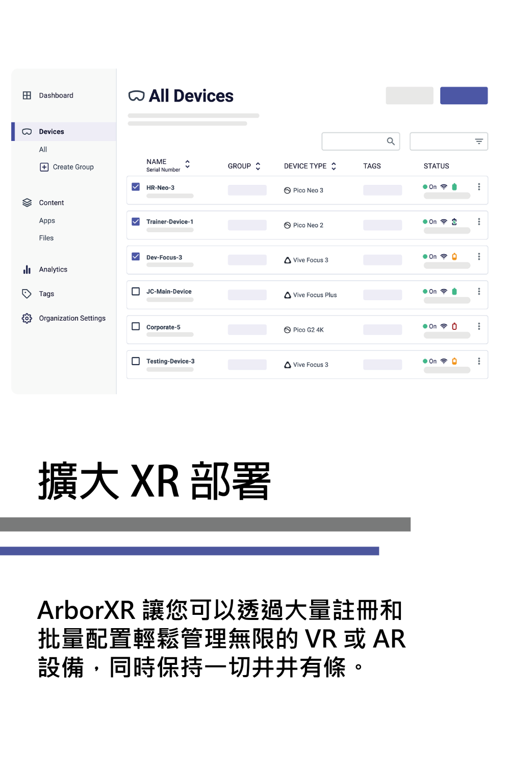 透過ArborXR,管理者或教師可以遠端管理和監控多種廠牌的XR設備,並在保障資訊安全的同時,也能夠輕鬆地安裝和部署教育相關的XR內容。