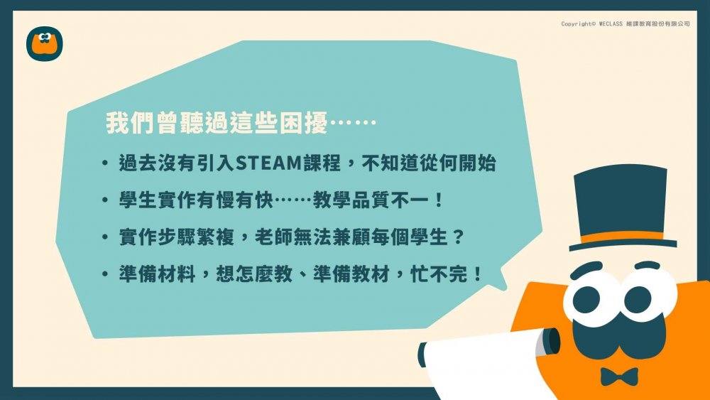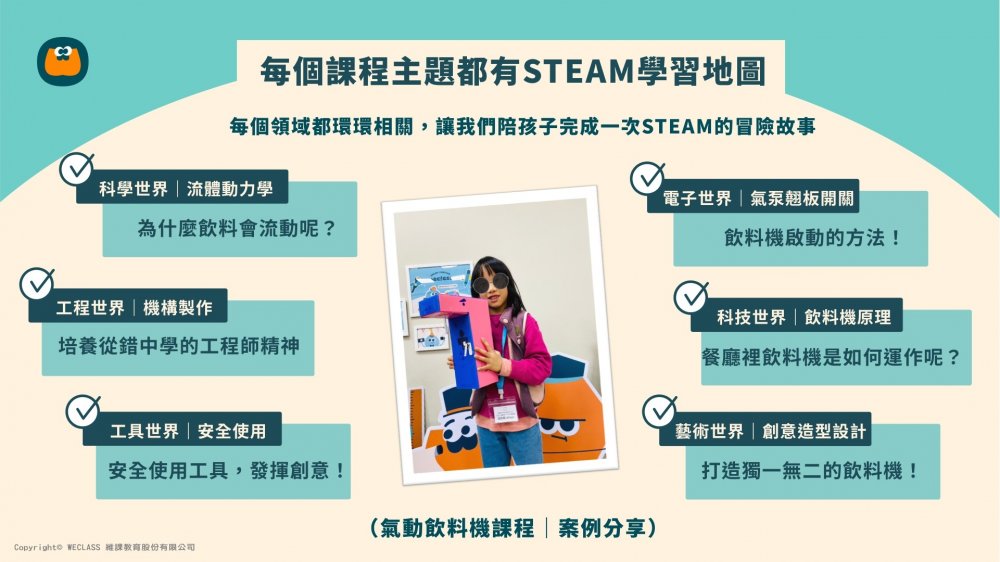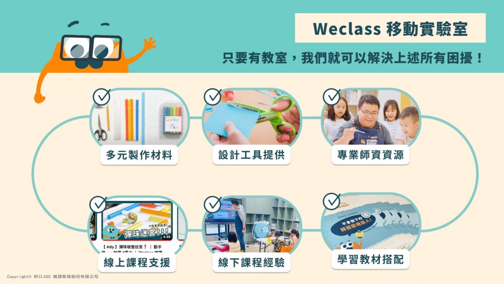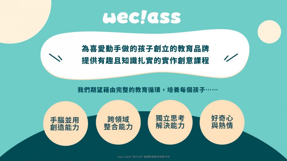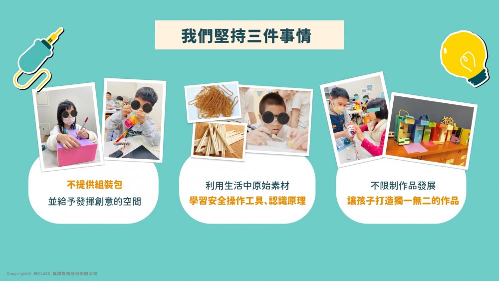 WeClass相信每個孩子都有獨特的創造能力,因此我們設計的教材和課程「不僅是讓孩子們完成作品」,更重要的是鼓勵他們了解原理、工具,並思考主題、發揮創意。透過使用生活中的原始素材和安全工具,加上孩子們的獨特想法,學生們可以打造出獨一無二的作品,同時也從中培養獨立思考和解決問題的能力,讓他們擁有勇氣實現夢想的創造力!