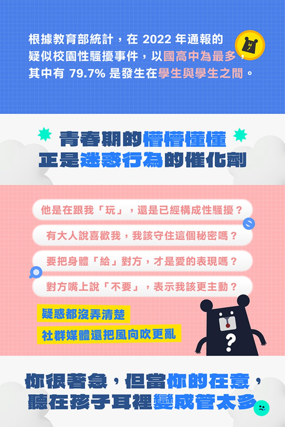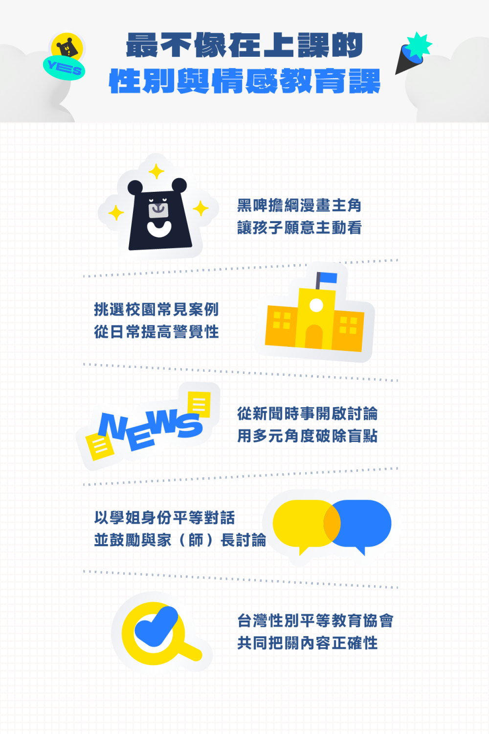 這是一堂為青春期的孩子整理關於:身體界線、情感意識、自我保護知識的課程。接住情竇初開的好奇心,更突破開口談性教育的害羞尷尬,才能學習正確的處理、求助方式!