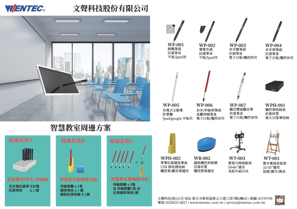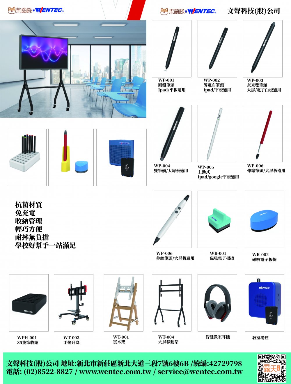文聲科技提供觸控屏幕周邊產品- 觸控筆, 收納筆座及電子板擦, 具備輕便堅固設計, 採用抗菌塑膠材質, 確保公眾場合使用衛生.