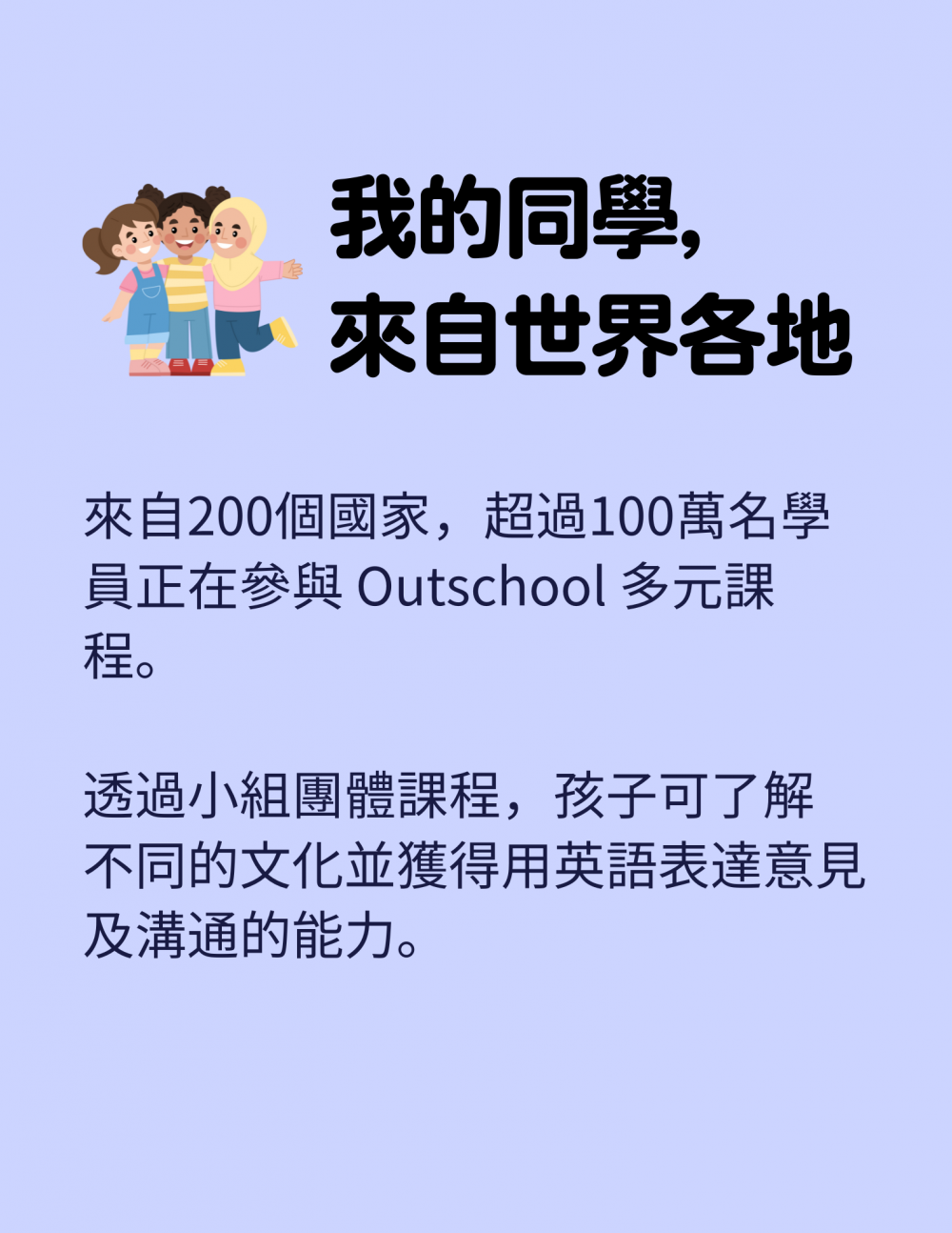 總部位於美國舊金山,是美國最大的線上學習平台,也是在家自學的首選教育平台,專為3-18歲的學生設計,透過各種主題、專業教師設計的課程,按照自己的方式學習,滿足孩子的興趣,且激發孩子對學習的熱忱。我們提供多種教學形式,包括一對一家教(One on one) 、有趣且互動多的小班制直播課程 (live online meeting)、可以隨時參加的彈性預錄課程(flex),以及主題式月費制的學生社團(groups),由一位專業的老師帶領,集結來自世界各地的學生,一起圍繞著感興趣的主題,共同研究及討論。Outschool是由前谷歌(Google)和Airbnb員工於2015年共同在矽谷創辦的線上教育平台,被全球最大的教育科技調研機構Holon IQ評選為2022,2023年教育科技的獨角獸公司。 亦被Fast Campus選為2021年最具創新力的公司。目前,全世界有200個國家/地區,超過100萬名兒童學習者均加入了Outschool快樂學習中。