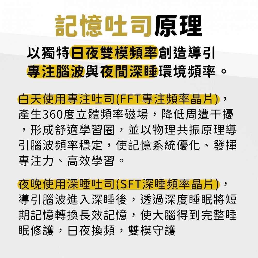 全年齡使用,記憶吐司內含獨家專注力晶片,運用頻率科技技術,創造提升大腦學習狀態的良好頻率,守護著孩子的學習及成長黃金期,並提升孩子學習的專注力!熟齡族協助白天情緒穩定,晚上延長深度睡眠
