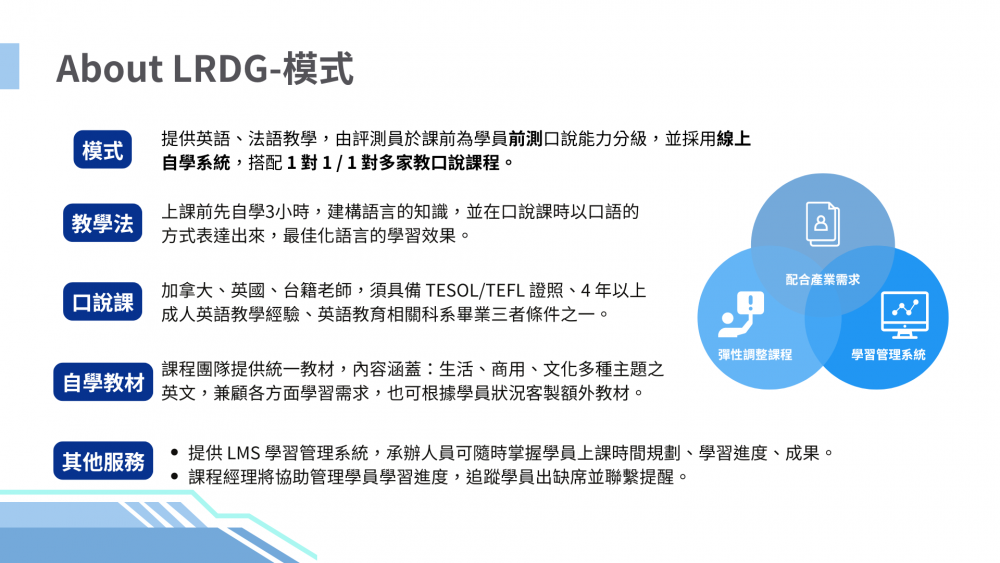 LRDG 於 2002 年在加拿⼤蒙特婁成立,在這 20 年中,LRDG 一直都是加拿⼤政府語言培訓最重要的合作夥伴,至今已經服務 250 個政府部門,幫助 30,000 名學員達成語言學習的目標,在台灣,我們積極佈局企業、公務部門、雙語教師市場,並為其開發適用之教材,幫助每一位學員可以紮實且有成效的精進英文口說實力。