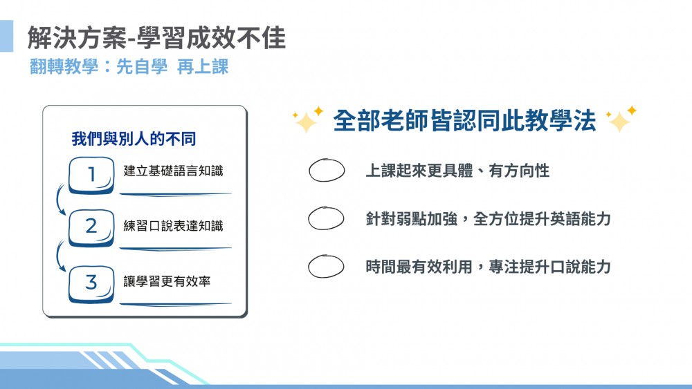 1. 以「先自學、再上課」翻轉教學模式為宗旨,學員可透過自學平臺於課前完成自學,先建構語言知識,並在與教師線上口說課程中實際演練,讓學習英文更有方向及效率。