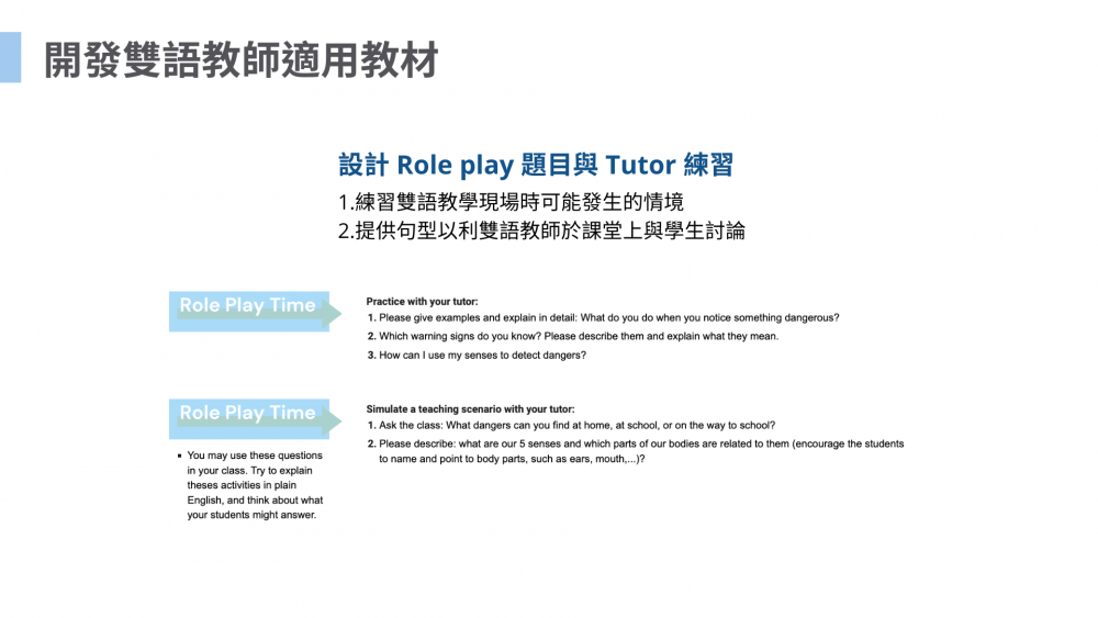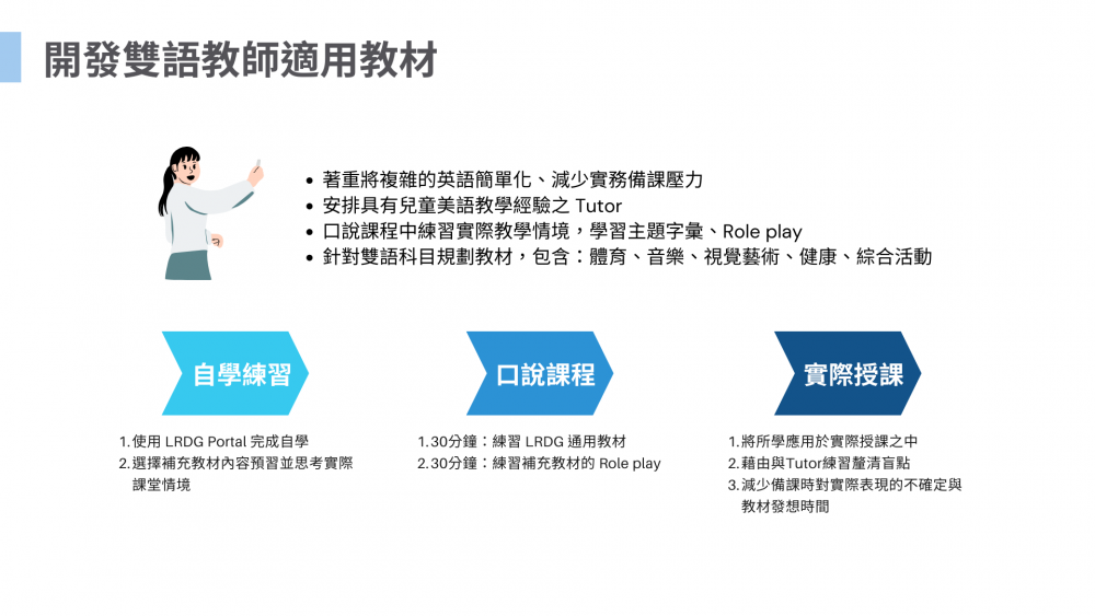 本課程針對部分領域雙語科目,設計對應學習教材、課室英文、口說課程練習題目,幫助雙語教師藉由口說課精進英文能力、預先與 LRDG 家教老師練習與模擬實際雙語教學情境,減輕雙語教學備課壓力與時間,提升備課成效,建立教師們的英文口說自信。