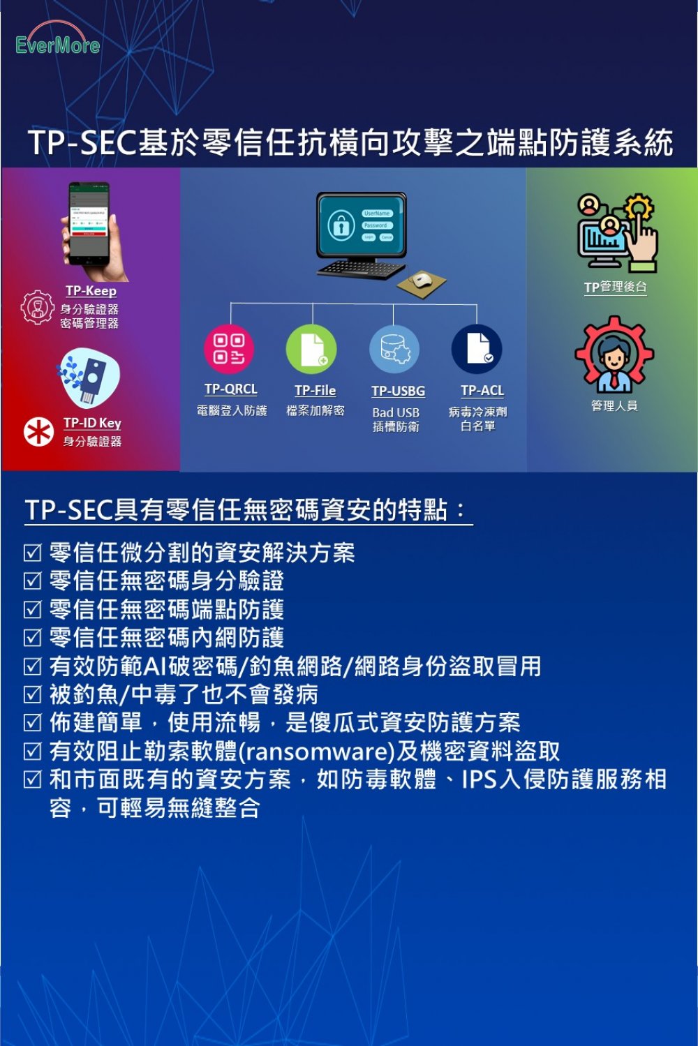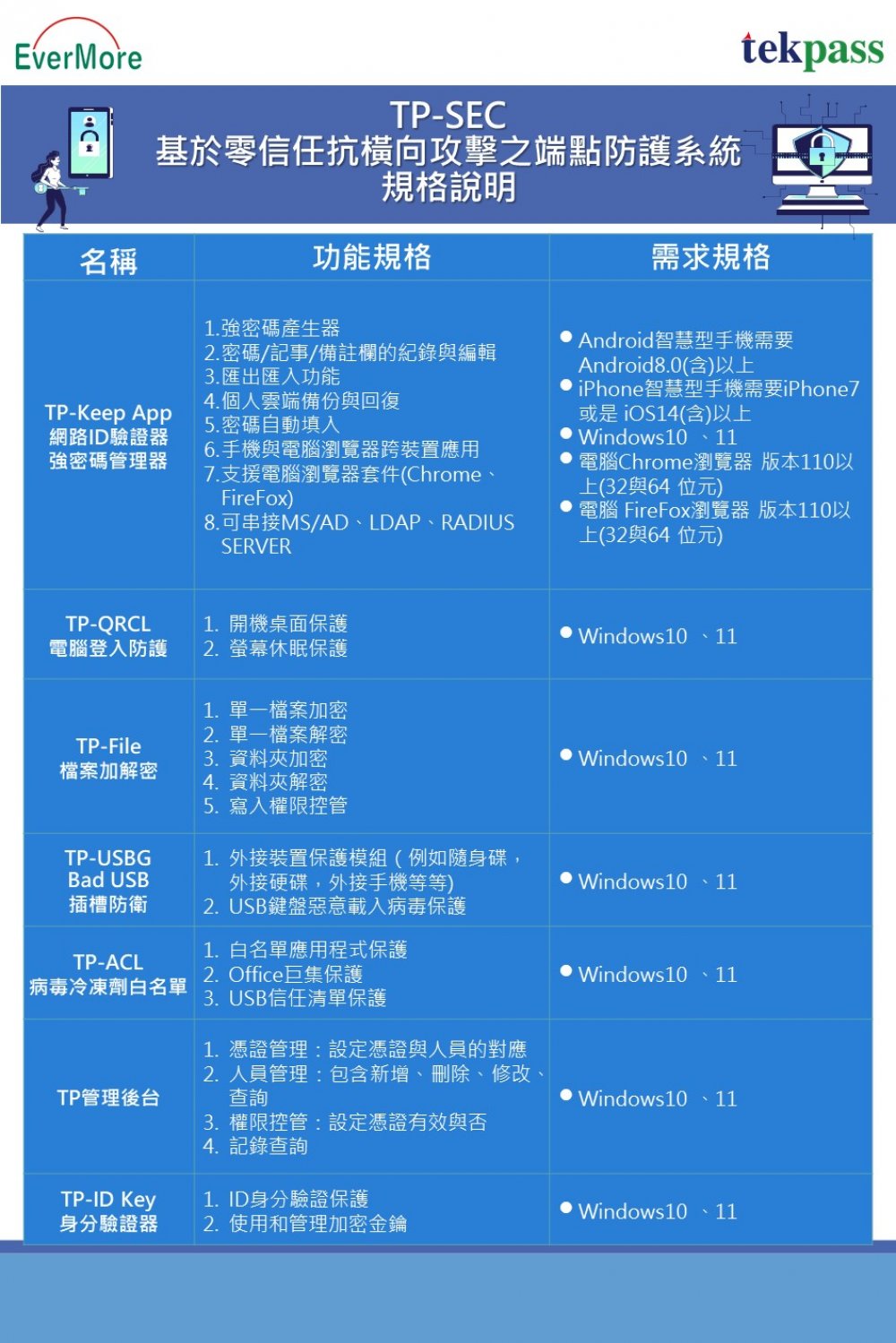 本系統導入零信任架構用以保護個人電腦上重要的資料與防止惡意軟體的不當執行,採取資安聯防,為個人電腦高築橫向攻擊的銅牆鐵壁,具備微分割的零死角防禦功能。
